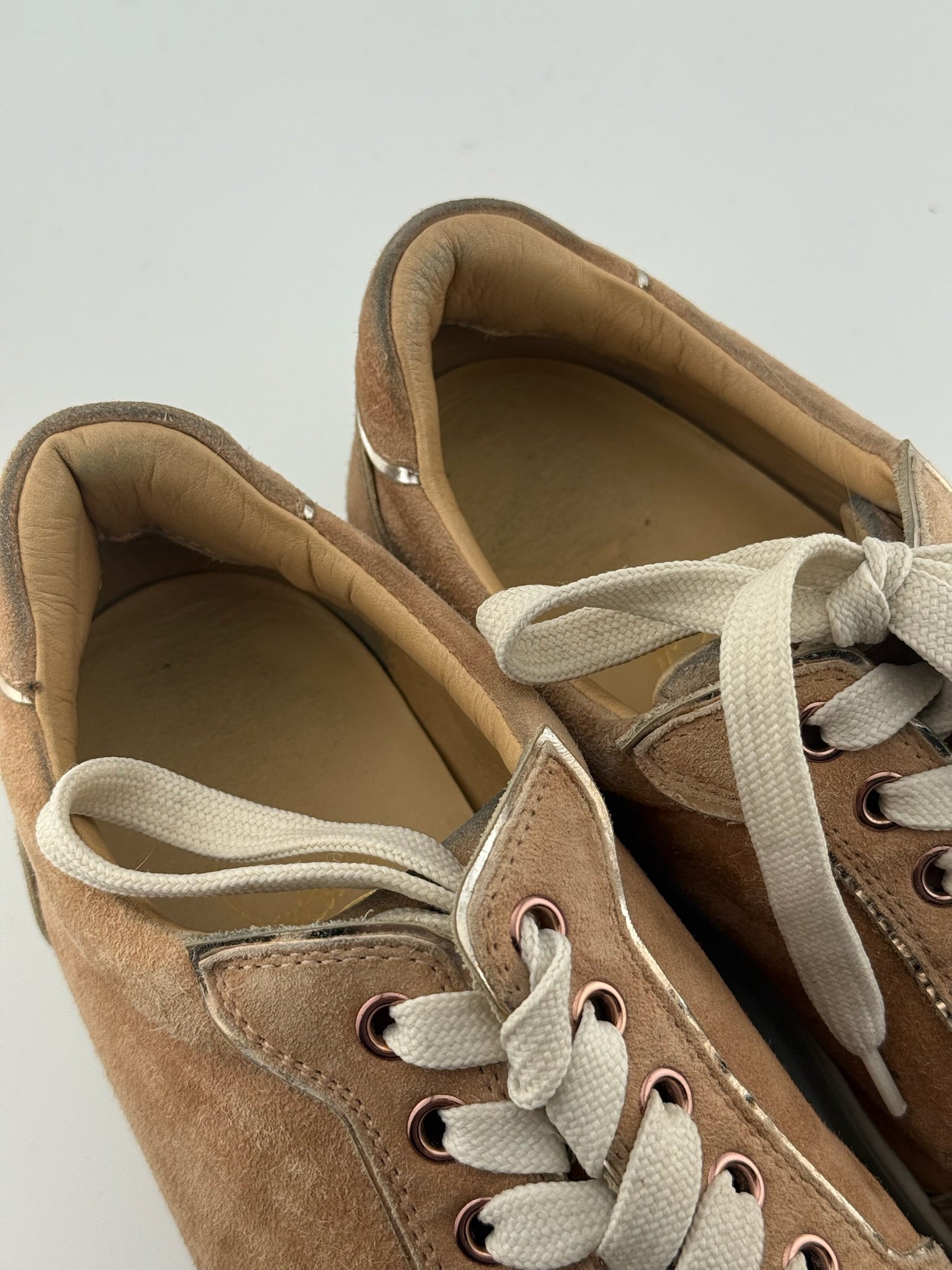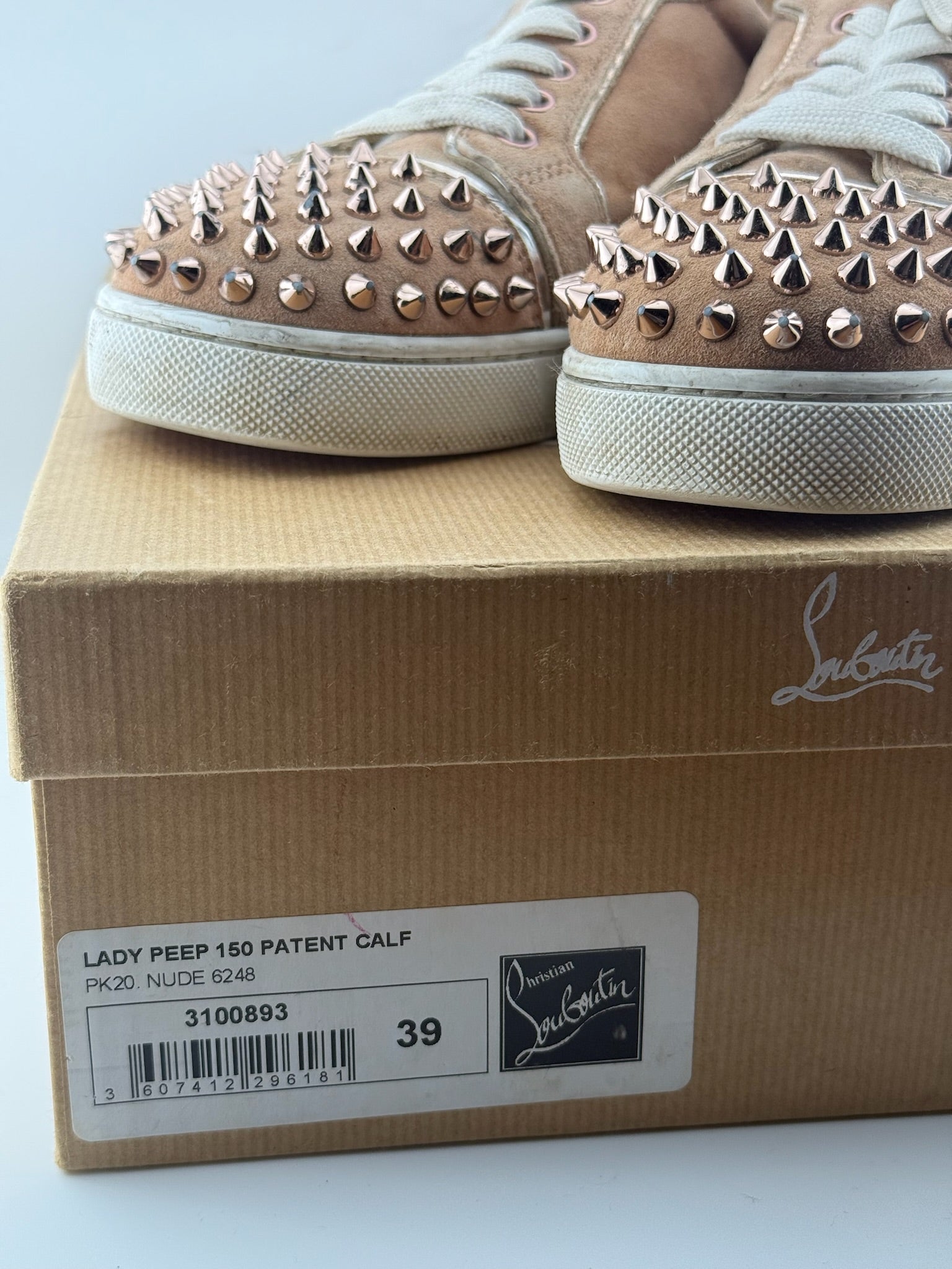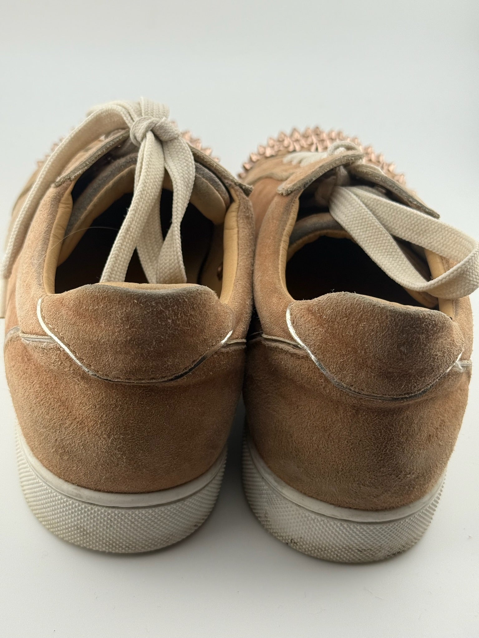 Authentic Christian Louboutin trainers in nude suede with signature spike studs and red soles. Includes original box.
