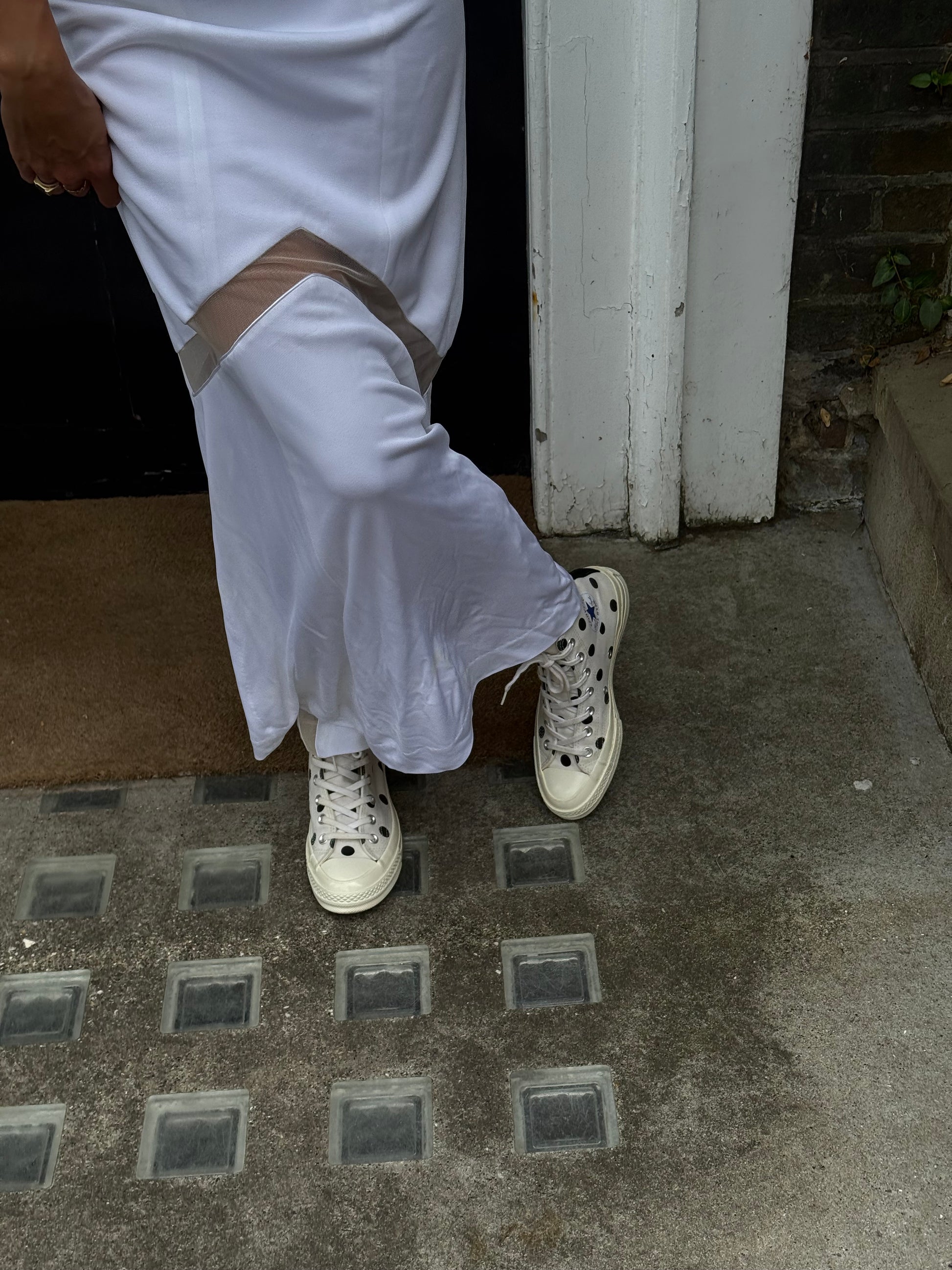 Very faint yellow marking around tail end of skirt. Unoticeable to the eye. Otherwise in stunning condition.
