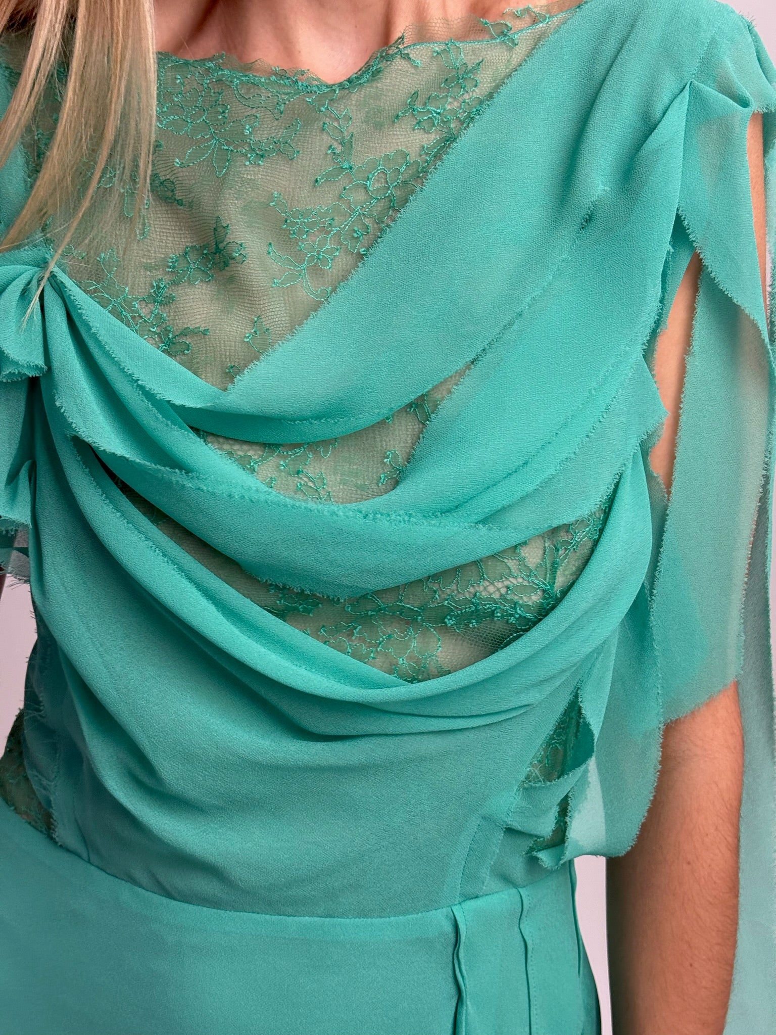 Embrace timeless elegance with the Nina Ricci Seafoam Midi Dress, featuring exquisite lace and drape details that beautifully enhance its silhouette. This stunning dress celebrates femininity and sophistication with its soft seafoam hue.