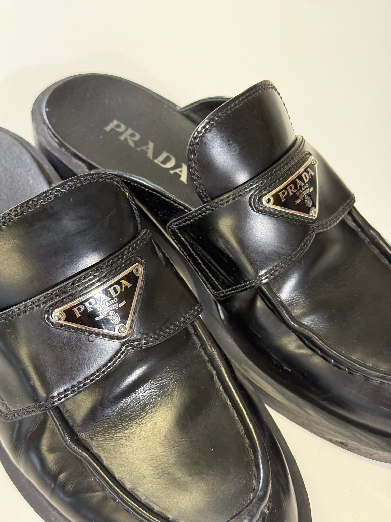 While these shoes show signs of wear and have missing studs, they still offer the unique Prada style and can be a great addition to your wardrobe for casual or dressy occasions. Pair them with a beautiful dress or tailored trousers for a polished outfit, and don't miss the chance to own these iconic mules at a great value!