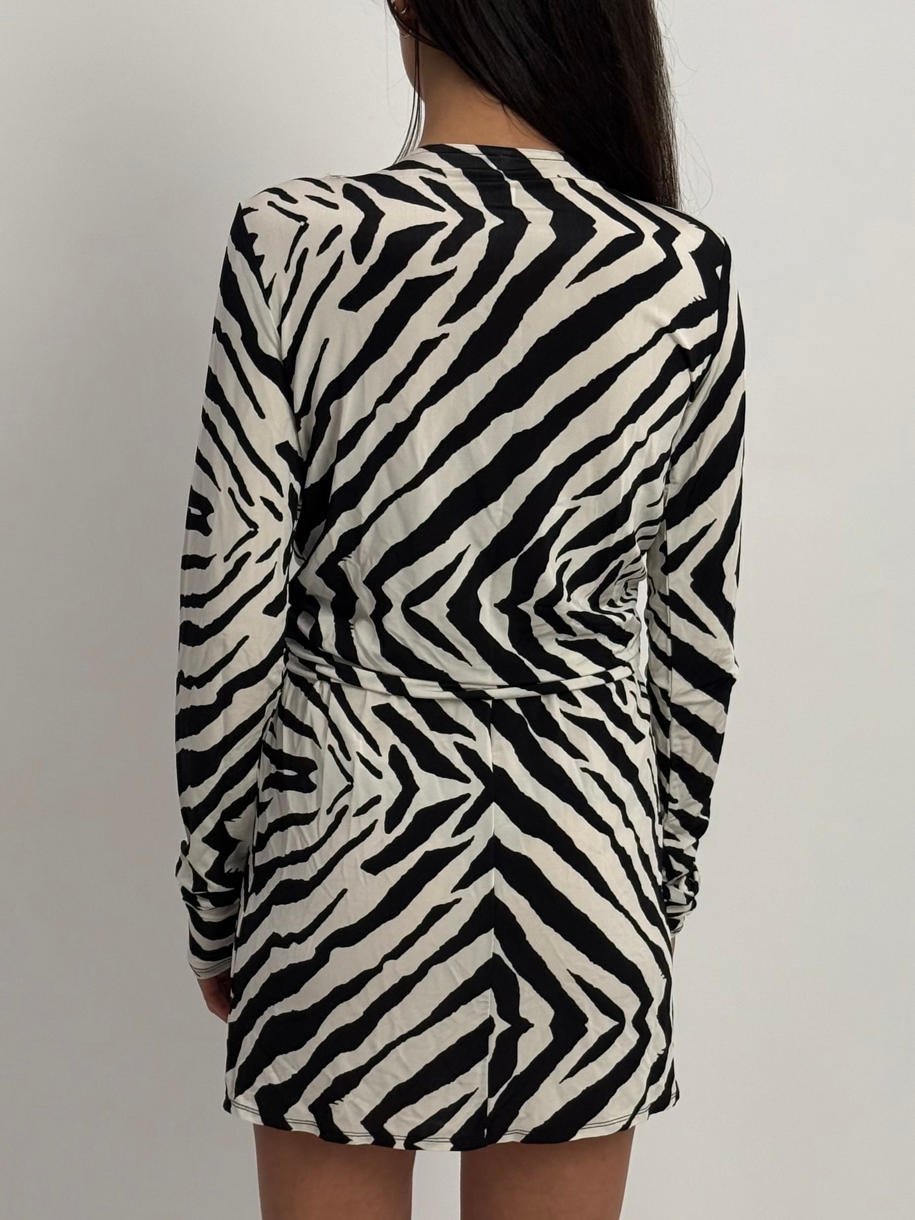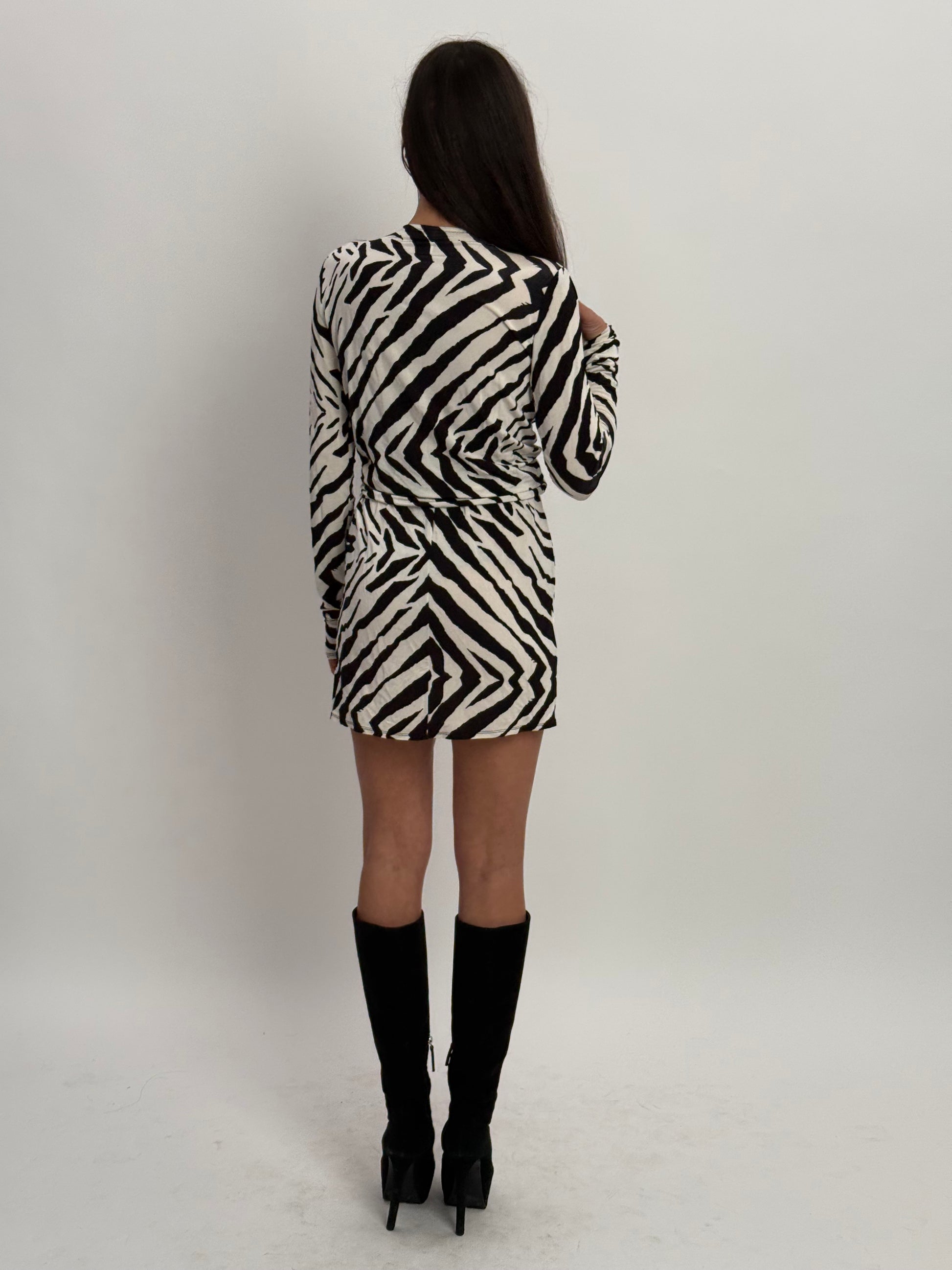 Make a bold fashion statement with the Rat & Boa Zebra Mini Wrap Dress, designed in a striking zebra print. Crafted from a comfortable blend of 95% viscose and 5% spandex, this dress offers a flattering fit with a playful and modern twist.