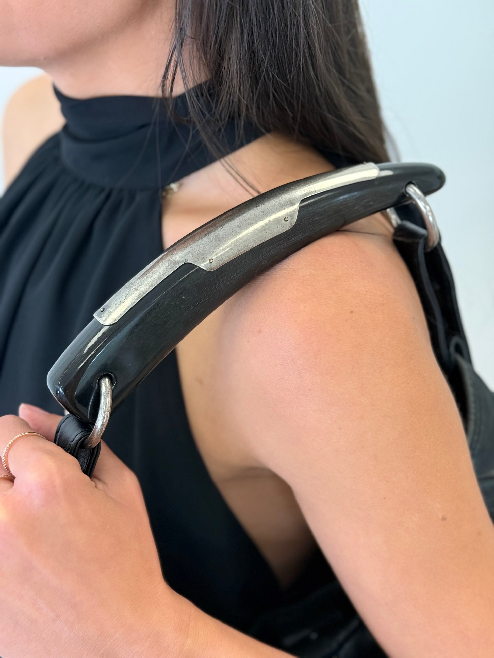 This striking Large Mombasa bag by Saint Laurent features a sleek black leather body and the iconic sculpted horn handle. A bold and timeless piece with an edgy yet elegant silhouette—perfect for collectors and fashion lovers alike.